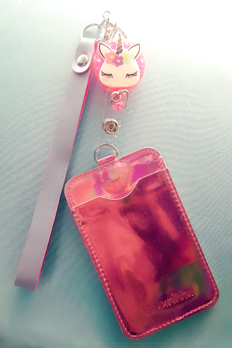 Pink Unicorn Badge Reel with Pink Hologram Cardholder and Wristlet Set