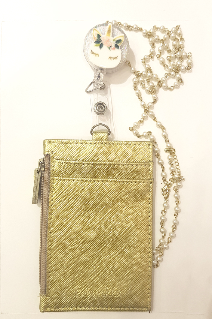 Unicorn Aurelia Badge Reel with Gold Zip Cardholder and Pearl Necklace Set